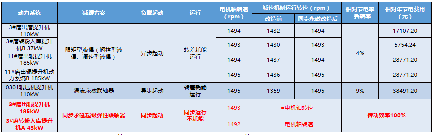 冲击是造成系统设备损坏主要原因之一,冲击伴随动力传动全过程,尤其在负载起动阶段。最传统办法是在传动链加转差限矩类偶合器(比如液偶、涡流永磁),但为此在整个运行过程必须付出转差发热损耗。在当下双碳形势下,非常有必要选用冲击无损坏、运行不耗能的柔性联轴器!河南锦荣水泥各动力系统采用同步永磁超级弹性联轴器改造后节电效果见下表: