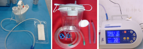 其中,负压伤口治疗仪依靠机械动力产生持续的恒定负压,该仪器作为负压治疗的负压源,其体积小、质量轻、成本低,以续航能力持久的锂电池为电源。封闭式负压引流敷料与负压伤口治疗仪配套使用,作为负压引流中兼有引流作用和储液作用的敷料。