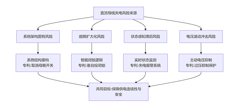 供电系统直流母线防失电...系统性地攻克了直流母线失电的难题。直流母线如同电力系统的“主动脉”,其失电会直接导致设备停运、生产中断,甚至在核电、钢铁等高危行业引发重大安全事故。例如,传统采用母联开关的分段母线设计,其母联开关本身就是一个潜在的故障点。一旦该开关故障,可能导致大面积停电。还有电压波动冲击、状态感知滞后等行业难题。为了更直观地理解传统系统的风险和新技术的对策,您可以参考下面的图示,清晰地展示了从“风险来源”到“防护技术”的完整逻辑。